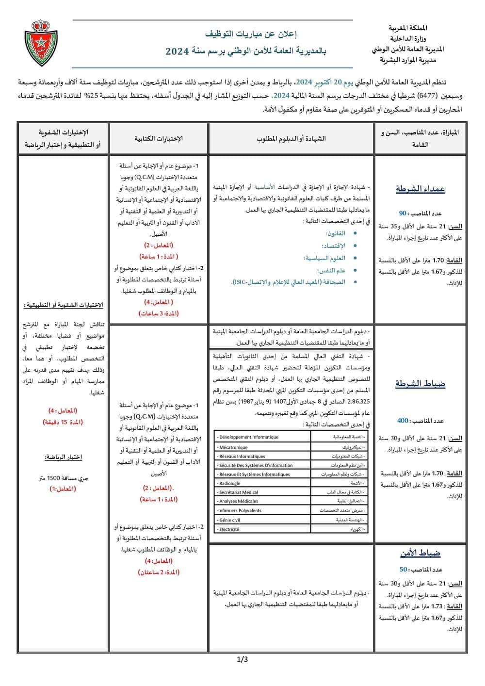 مباراة الأمن الوطني الشرطة 2024 Concours Police DGSN: المديرية العامة للأمن الوطني تعلن عن عملية توظيف ستهم 6477 منصبا وستكون مفتوحة في وجه الشباب المغاربة الحاصلين على شهادة البكالوريا فما فوق، لولوج مختلف أسلاك الشرطة المغربية. وتتوزع المناصب على النحو التالي: