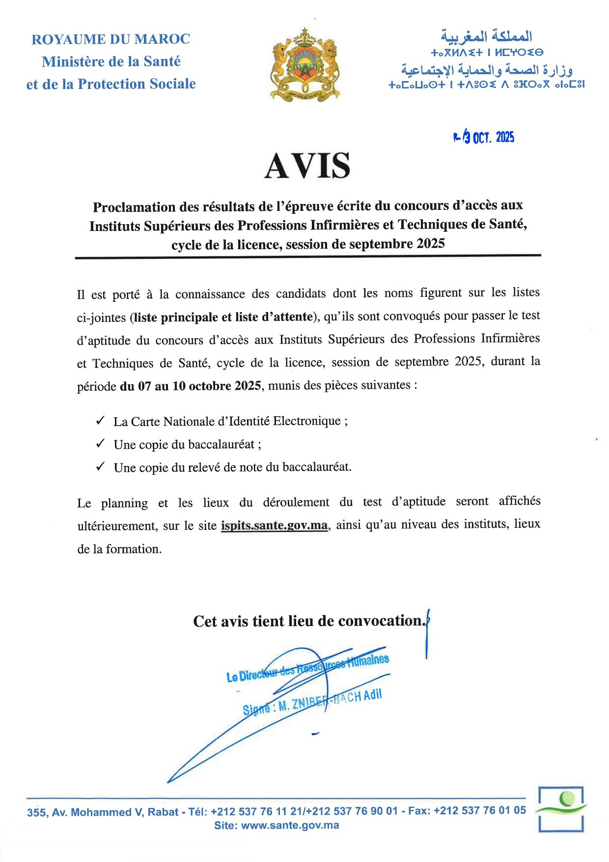 يُنهى إلى علم المترشحين الواردة أسماؤهم في اللوائح المرفقة (اللائحة الرئيسية ولائحة الانتظار)، أنهم مدعوون لإجراء اختبار الأهلية (Test d’aptitude) لمباراة ولوج المعاهد العليا للمهن التمريضية وتقنيات الصحة، سلك الإجازة، دورة شتنبر 2025، وذلك خلال الفترة الممتدة من 07 إلى 10 أكتوبر 2025، مصحوبين بالوثائق التالية: